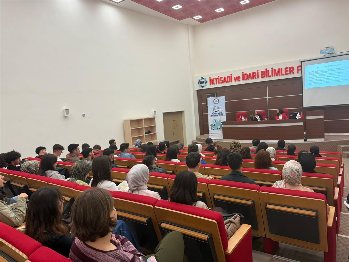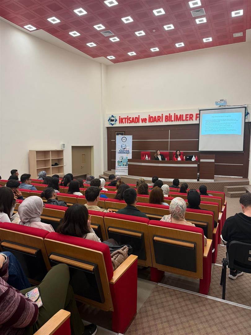 Kariyer Merkezi bünyesinde 01.10.2025 tarihinde saat 14:00’da İktisadi ve İdari Bilimler Fakültesi Kırmızı Salon’da Siyaset Bilimi ve Kamu Yönetimi Bölümü’nden Doç. Dr. Burçin DEMİRBİLEK ve Hukuk Fakültesi Kamu Hukuku Bölümü’nden Dr. Öğr. Üyesi Gülen SOYASLAN AKDEMİR hocalarımızın katılımıyla “Yurtdışı Lisansüstü Eğitim ve Burs Olanakları” adlı bir sunum gerçekleştirilerek öğrencilerimize mezuniyet sonrası Yüksek Lisans ve doktora burs programları hakkında bilgi verilmiş ve yurtdışı eğitimle ilgili tecrübeler paylaşılmıştır.